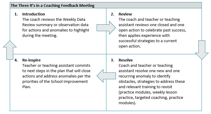 The instruction coach uses a critical tool to guide coaching conversations, applying this formula to guide their interactions when supporting teachers and teaching assistants in effective teaching.