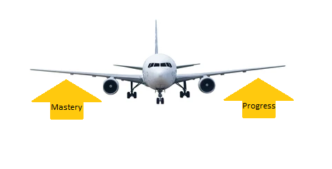 Mastery and progress need to be balanced for students to make progress. The plane also needs altitude, meaning mastery and progress both need to be lifted.