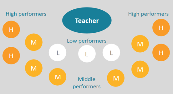 Lowest performers are placed directly in front of the teacher. Place these students in the first row if there is more than one row.