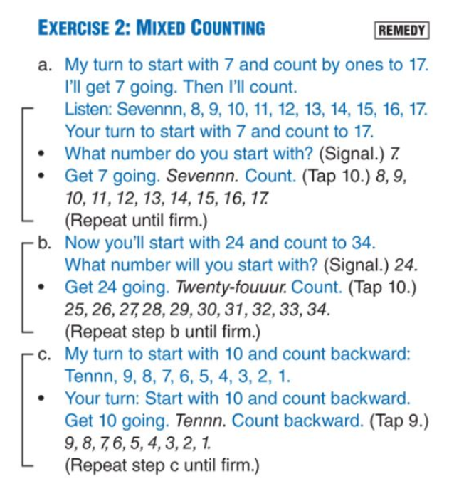 • If a question or task is not answered correctly and fluently, such as counting, the teacher repeats the instructions and responses until students answer the series of responses without error.