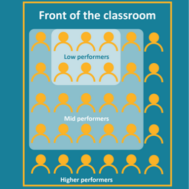The lowest-performing students sit directly in front of the teacher. Middle performers are around the lower performers. Higher-performing students sit on the ends of the semicircle or in the second row.