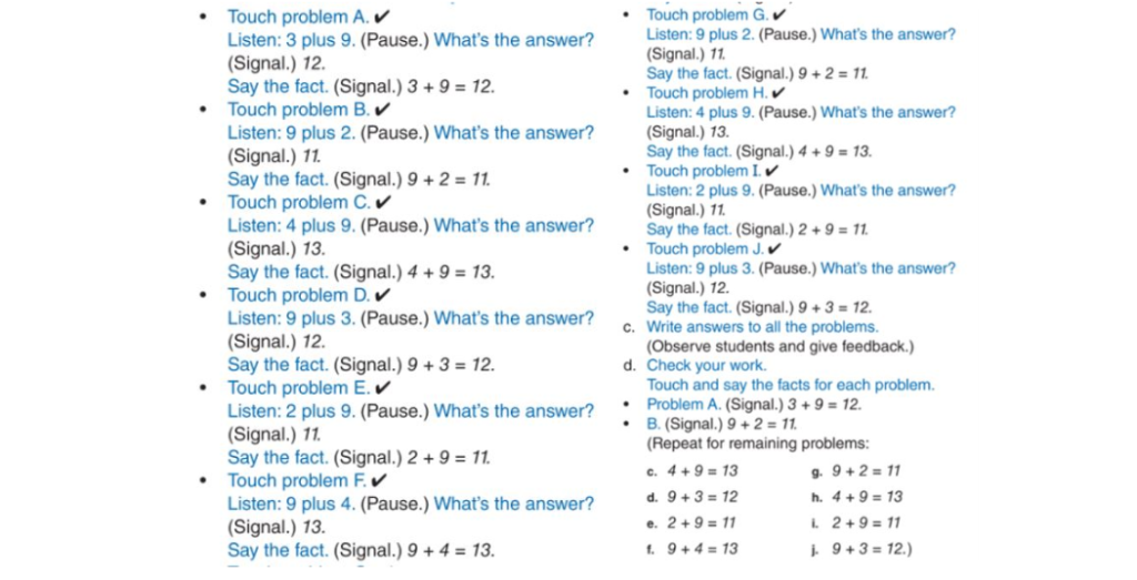 In the first step in the cycle of learning facts, students say the four facts for each family. They then write the answers to the addition and subtraction facts for the family.