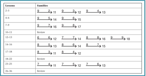 Facts are taught in sets. The first set of facts work with 9. In CMC D, students always work verbally with fact problems before they write the answers.