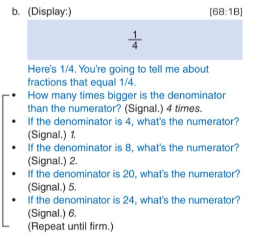From lesson seventy, students complete equivalent fractions by applying information about the relationship of numerator and denominator.