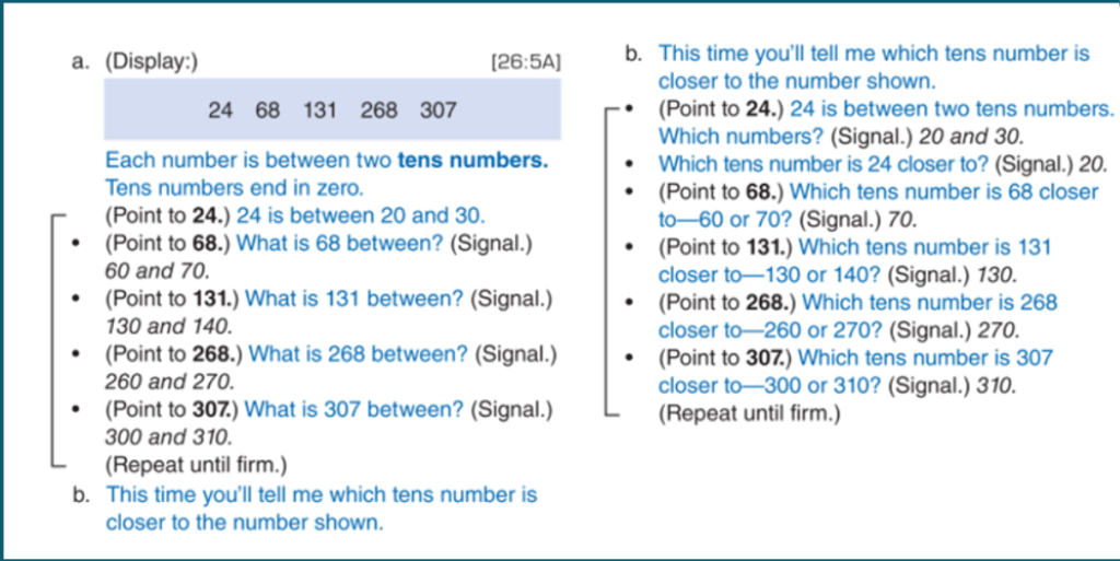 - Say, ‘This time you’ll tell me which tens number is closer to the number shown.’ Point to 24, say ’24 is between two tens numbers. Which numbers?’ and signal. Ask, ‘Which tens number is 24 closer to?’ and signal.