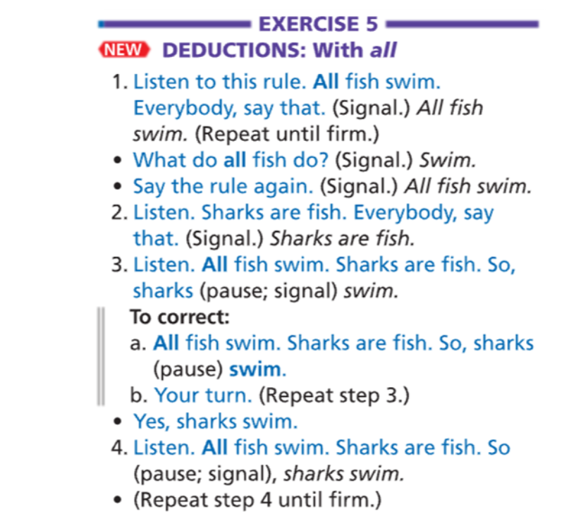 The deductions track, begins in lesson 1 and continues through lesson 60. It teaches students different types of deductions. The easier forms involving all and every are introduced first, followed by more difficult forms involving no, do not and some.