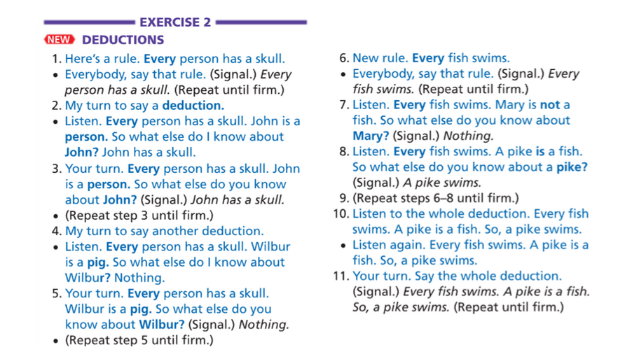 The third format (lesson 29) teaches students to figure out the middle step of a deduction. Students are given a rule (every person has a skull) and a conclusion (John has a skull). They learn to construct the middle step (John is a person) by eliminating the words that appear in both the rule and conclusion (has a skull).