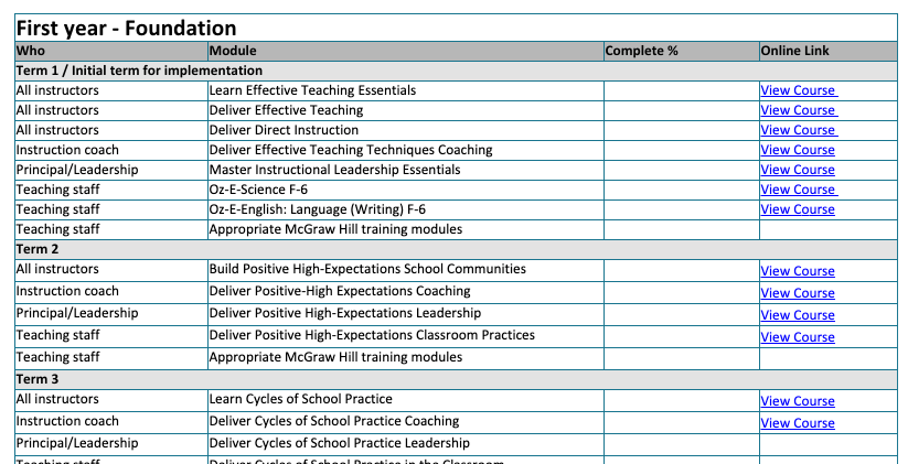 An example of a Professional Learning Plan is shown below. It shows the modules that should be completed each term for every role over a four-year period. It also shows an schedule of assessments to be completed by each faculty member throughout the year alongside their date for completion.