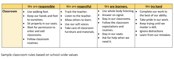 These values, also known as expectations, use general but memorable words that can be applied to all spaces across the school. Below is an example of four school-wide values: