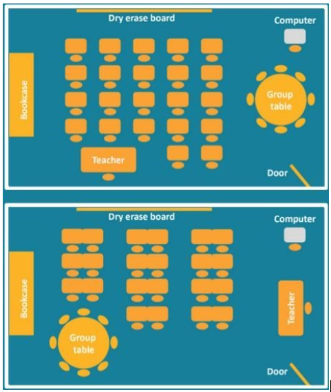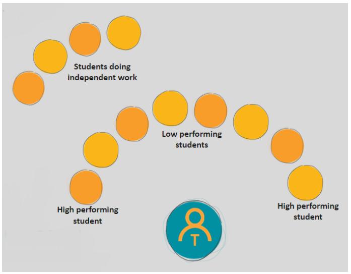 Lower levels of DI programs specify that students sit in chairs arranged in a semicircle. The teacher sits at the front so that every student can be observed, including both the group that is receiving instruction as well as other students completing independent work.