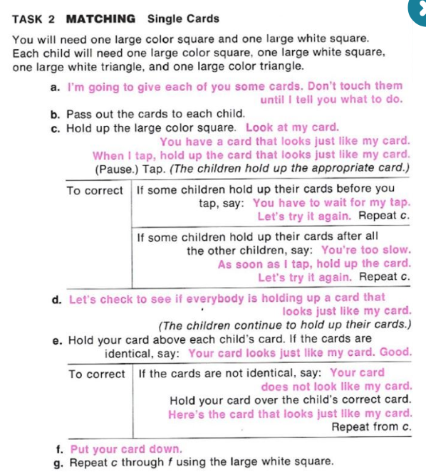 - Focus: ‘Look at my card. When I tap, hold up the card that looks just like my card.’