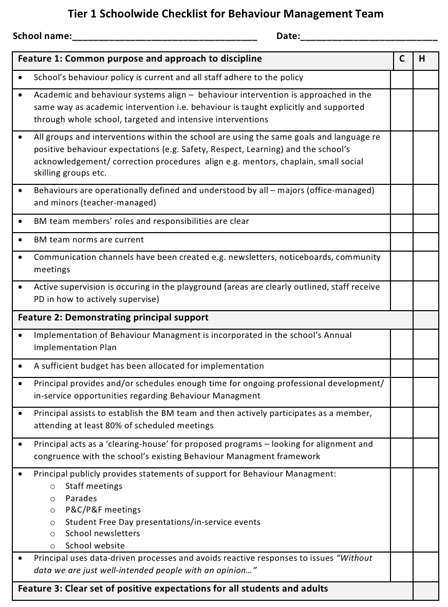 Tier 1 School-wide Checklist for Behaviour Management