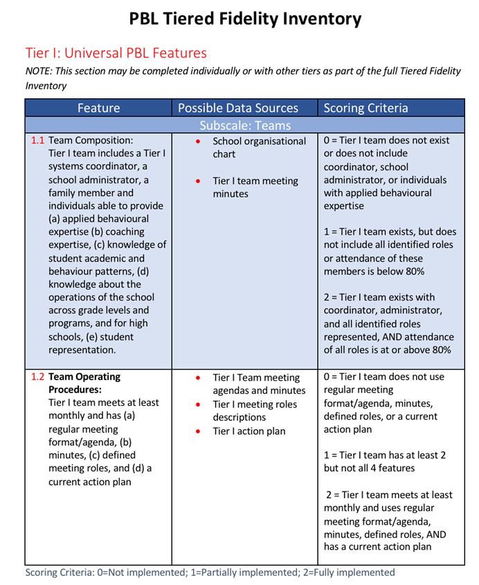 To perform a more in-depth evaluation of a school’s Behaviour Management Model, school leaders can use the Tiered Fidelity Inventory (TFI). The TFI is a PBIS-founded assessment tool that measures the extent to which the school team is applying the core features of the Behaviour Management Model in all three tiers.
