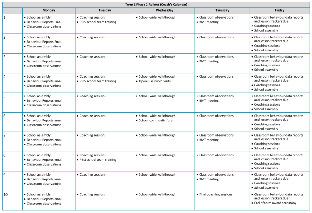 Below is a sample routine-oriented calendar for coaches and school leaders for Term 1 in the second year of the rollout of a school’s positive high-expectations Behaviour Management Model.
