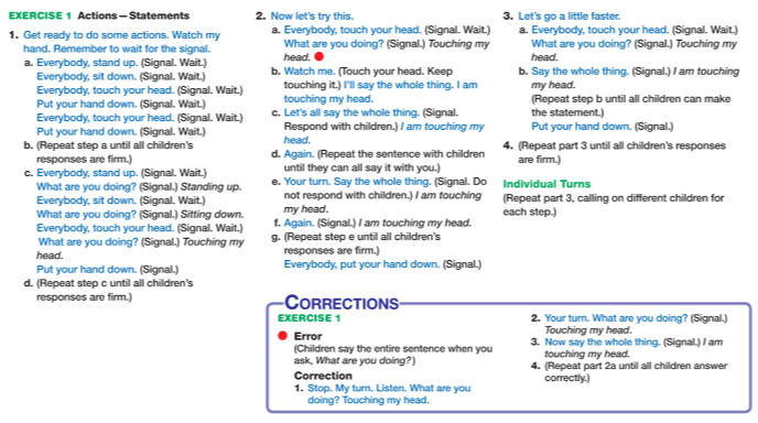 - Make sure students do not respond with a complete statement, ‘I am touching my head’, when they are just supposed to label the action, ‘Touching my head’.