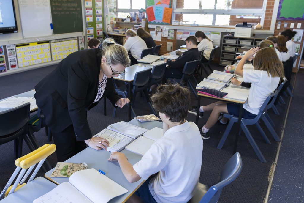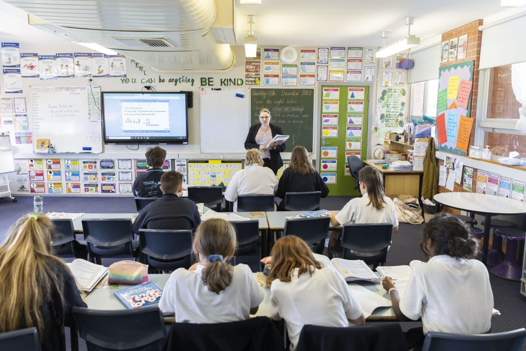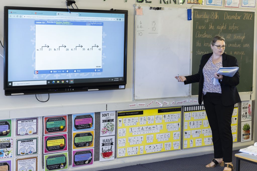 Teacher Sandy is delivering a Connecting Math Concepts lesson. She starts by modelling a new division maths concept for students. She gets the students’ attention and shows them how to complete the division procedure. As she models, she talks through every step she completes.
