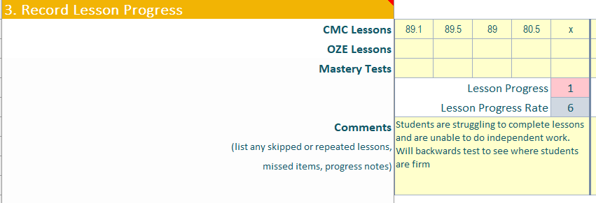 His students are not meeting the criterion as lessons continue. His students are moved back twenty lessons, repeating them to master the content. His students are not on track nor are they catching up.