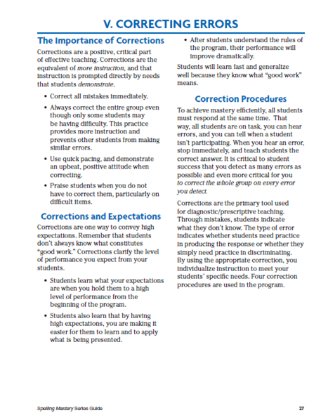 In addition to the general error correction procedure, there are specific error corrections for Direct Instruction programs. Some programs have boxed correction scripts in the Teacher Presentation Book page that fade over time as the teacher commits them to memory.