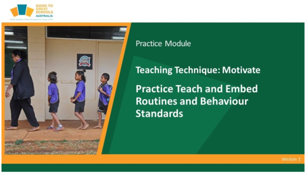 Teach and Embed Routines and Behaviour Standards is a practice module that goes in depth for participants to learn what happens when the technique is delivered with fidelity. They learn what happens when using routines and expectations is not delivered with fidelity. The barriers and how to overcome the barriers to deliver using routines and expectations with fidelity.