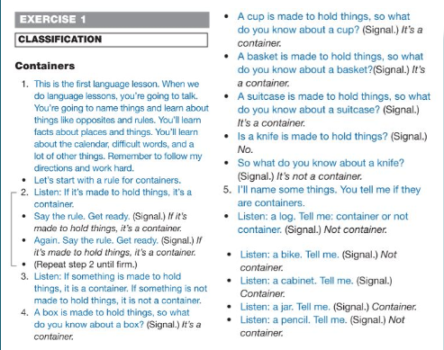 - Say; “Let’s start with a rule for containers. Listen: if it’s made to hold things, it’s a container. Say the rule. Get ready!” and signal (hand-drop). Say; “Again, Say the rule. Get ready!” and signal (hand-drop).