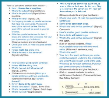 • The teachers says, ‘Item one: Horses live a long time. What’s the subject?’ and signals (auditory). ‘What’s the predicate?’ and signals (auditory). ‘What’s the verb?’ and signals (auditory).