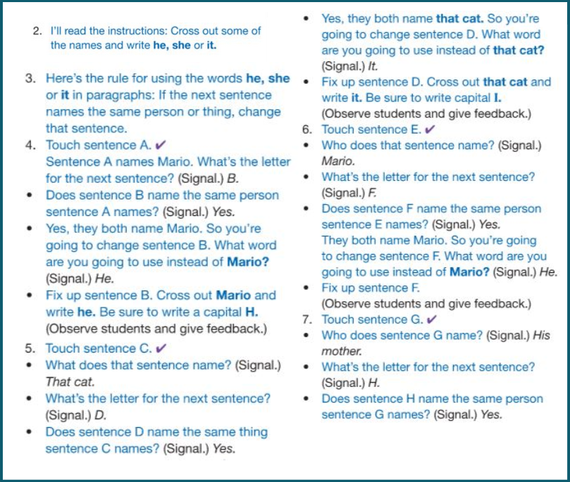 • The teacher says, ‘Touch sentence A’ and scans students. ‘Sentence A names Mario. What’s the letter for the next sentence?’ and signals (auditory). ‘Does sentence B name the same person sentence A names?’ and signals (auditory). ‘Yes, they both name Mario. So you’re going to change sentence B. What word are you going to use instead of Mario?’ and signals (auditory).