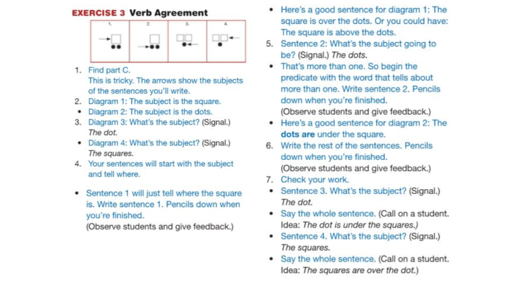 • The teacher says, ‘This part is tricky. The arrows show the subjects of the sentences you’ll write. Diagram one: the subject is the square. Diagram two: the subject is the dots. Diagram three: What’s the subject?’ and signals (auditory). ‘Diagram four: What’s the subject?’ and signals (auditory).