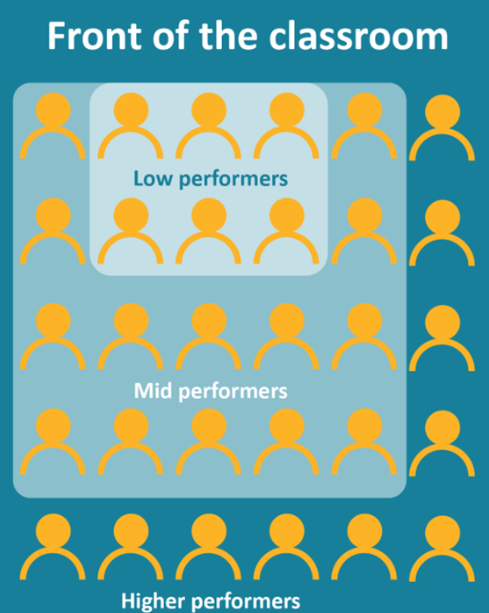 Seat students who need the most help close to the front of the room. Arrange middle performers around the lower performers. Seat highest performing students on the periphery.