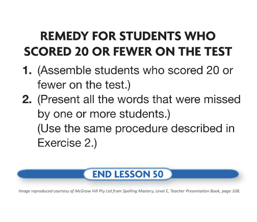 Teacher Matilda is teaching spelling. She gives mastery test twelve, reviews the results and finds that four students have not passed the assessment. Matilda remediates the students and retests them. The students pass the mastery test on the second try. After reviewing the results again, she notices that a few students had trouble with words that had ‘aw’ in them. Matilda puts extra emphasis on words with ‘aw’ in them as she moves forward in teaching her lessons.