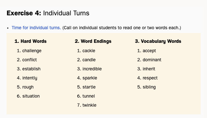All word practice exercises are presented to the entire group. The word “Everybody” in the script indicates that students respond together as a group when the teacher provides the signal. The last exercise in the word practice section of the lesson is called individual turns. In this section, you will find the words that students have practised for that lesson. The script directions will indicate that the teacher should call on individual students to read one or two words each. (See RMT 4, Exercise 4 from Lesson 5, page 4).