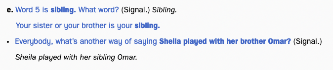 Scenario: Student makes an error on the question presented on the first bullet when asked to apply the word “sibling” in a sentence.