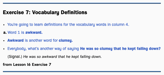 Here is an example of an oral definition exercise: Exercise 7 from RMT 4 Lesson 16. The teacher tells students the definition before asking the group to apply the word in a sentence.