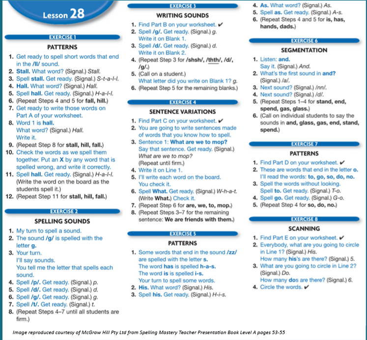 An example of spelling skills taught in tracks is seen in Spelling Mastery A Lesson 28.