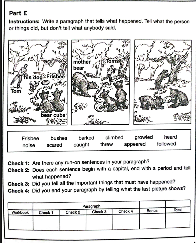 The Expressive Writing 1–2 instructional design includes the use of pictures and picture sequences to build writing skills. These pictures and picture sequences are carefully designed in the Expressive Writing exercises to help students have a concrete referent to write about.