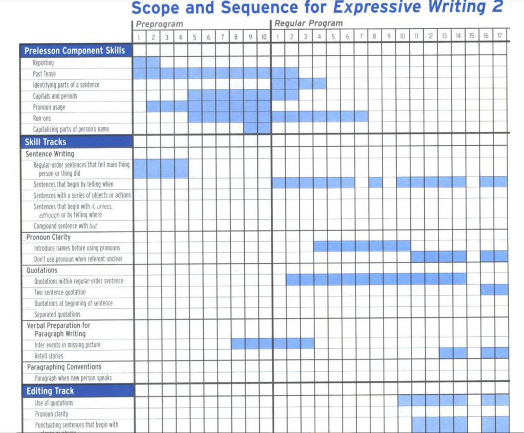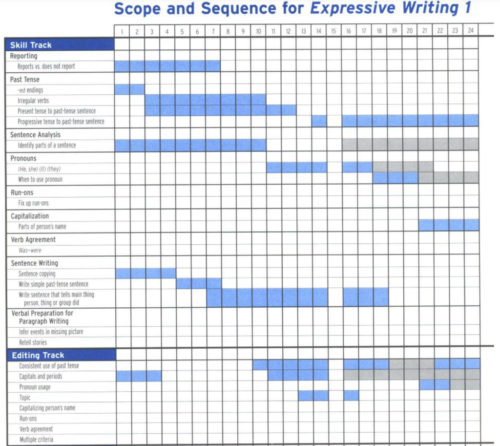The track design enables teachers to introduce a manageable amount of new information while providing the students with practise of what they have been taught previously. The scope and sequence for Expressive Writing is a teacher resource. This resource allows teachers to plan which lessons skills are introduced and taught, and which require practise over a few lessons.