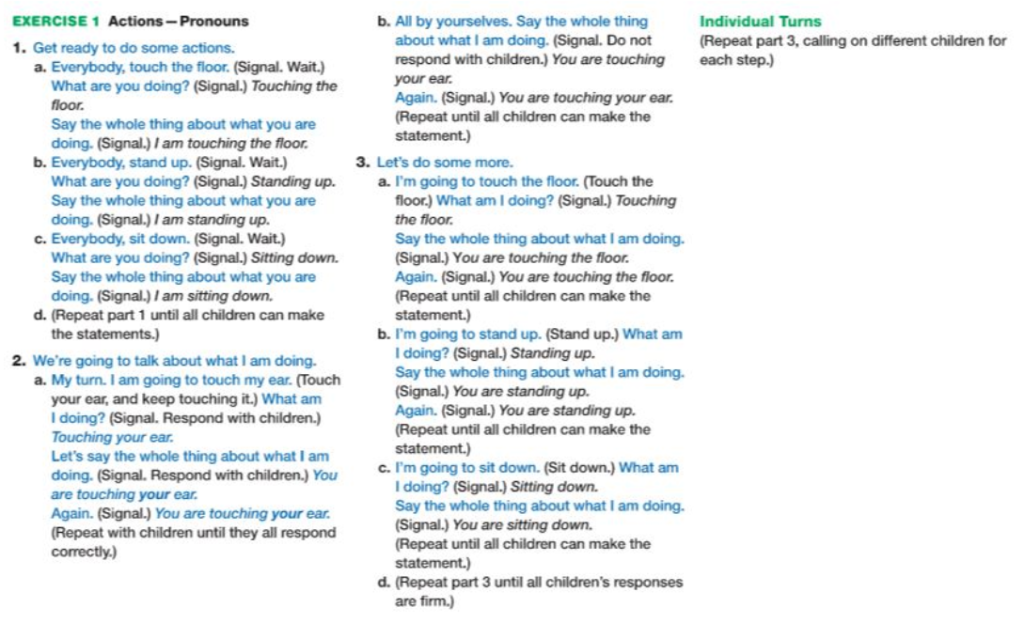 - The teacher says, ‘All by yourselves. Say the whole thing about what I am doing’ and signals (hand drop).