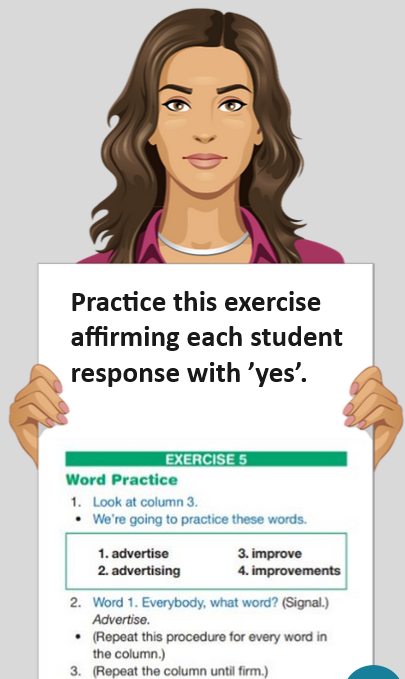 Affirmations are an example of this. An affirmation is simply the word ‘yes’ in a positive, lively tone followed by the student’s answer. Affirmations provide another repetition for students and validate their correct answer. Affirmations are scripted within a lesson or added on by the teacher.