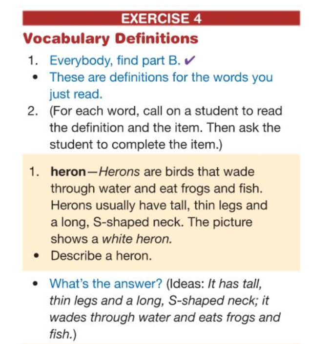After vocabulary words are introduced, they are reviewed in different kinds of exercises. Some appear in the textbook. For these exercises, students identify the meaning of a word and then use it in context. Other vocabulary words are reviewed in workbook exercises. In workbook exercises. Students use a list of vocabulary words to complete sentences or crossword puzzles.
